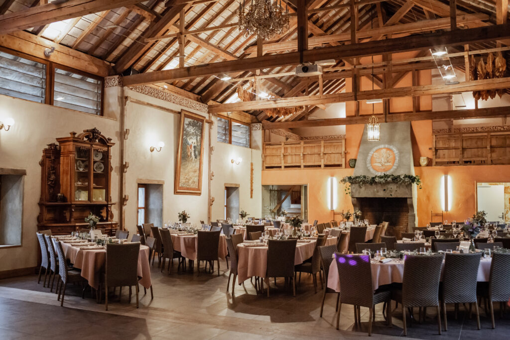 Ainsi, la charpente monumentale confère à la salle une présence rare. Les vitraux colorés diffusent une lumière douce et changeante au fil de la journée. Par ailleurs, la cheminée, impressionnante et sculpturale, apporte une touche chaleureuse à l’ensemble.